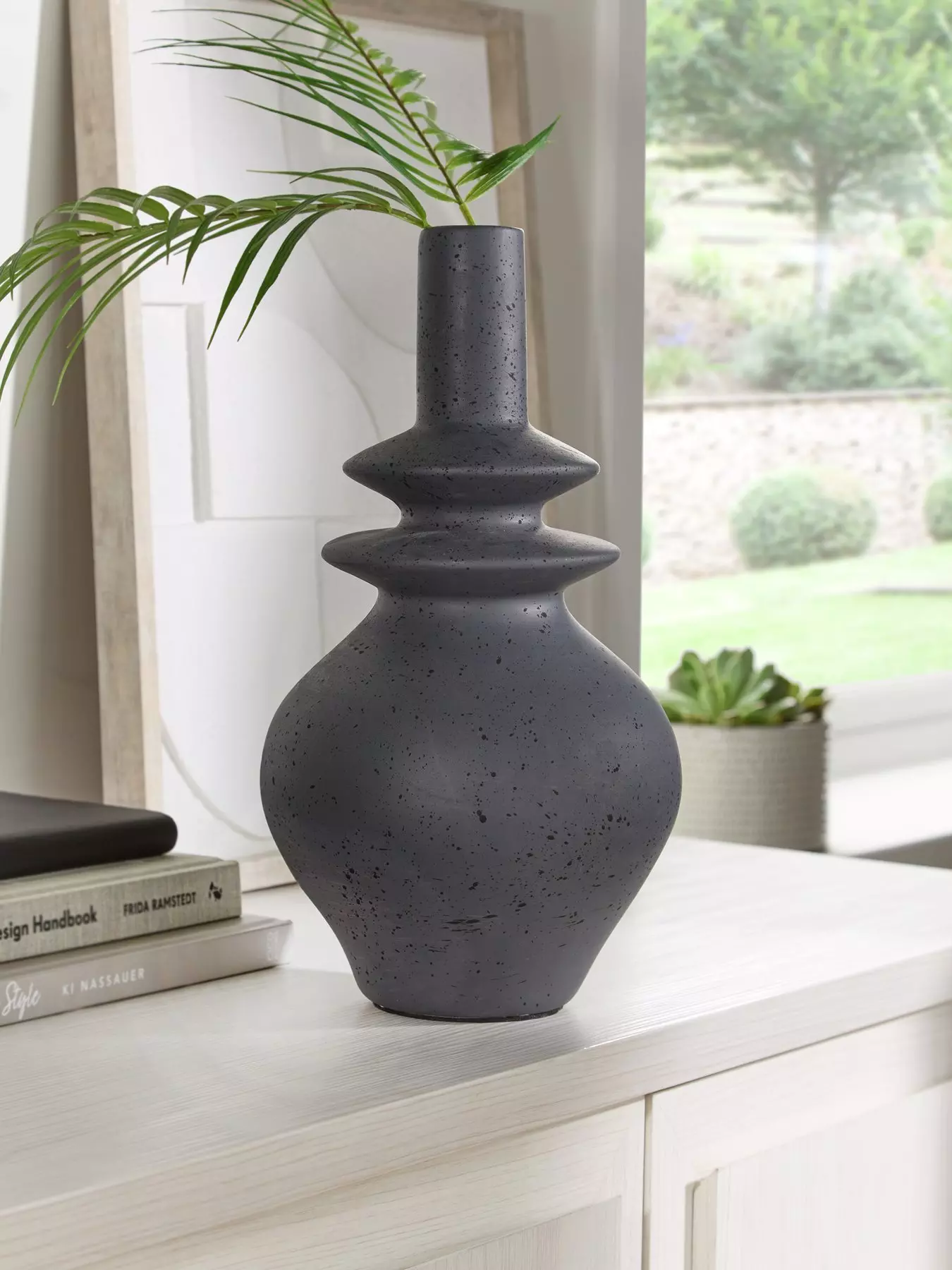 Taking its inspiration from contemporary art pieces, our Totem Fin Vase has a sense of sculptural beauty that’s effortlessly eye-catching.The rounded base makes way for the incredibly unique neck of the vase, which undulates to create a wavy visual that demands the attention. Its deep and mysterious grey colourway uses speckled patterning to build depth in the design. Pop on a sideboard or shelf and for a look that’s easy to love.