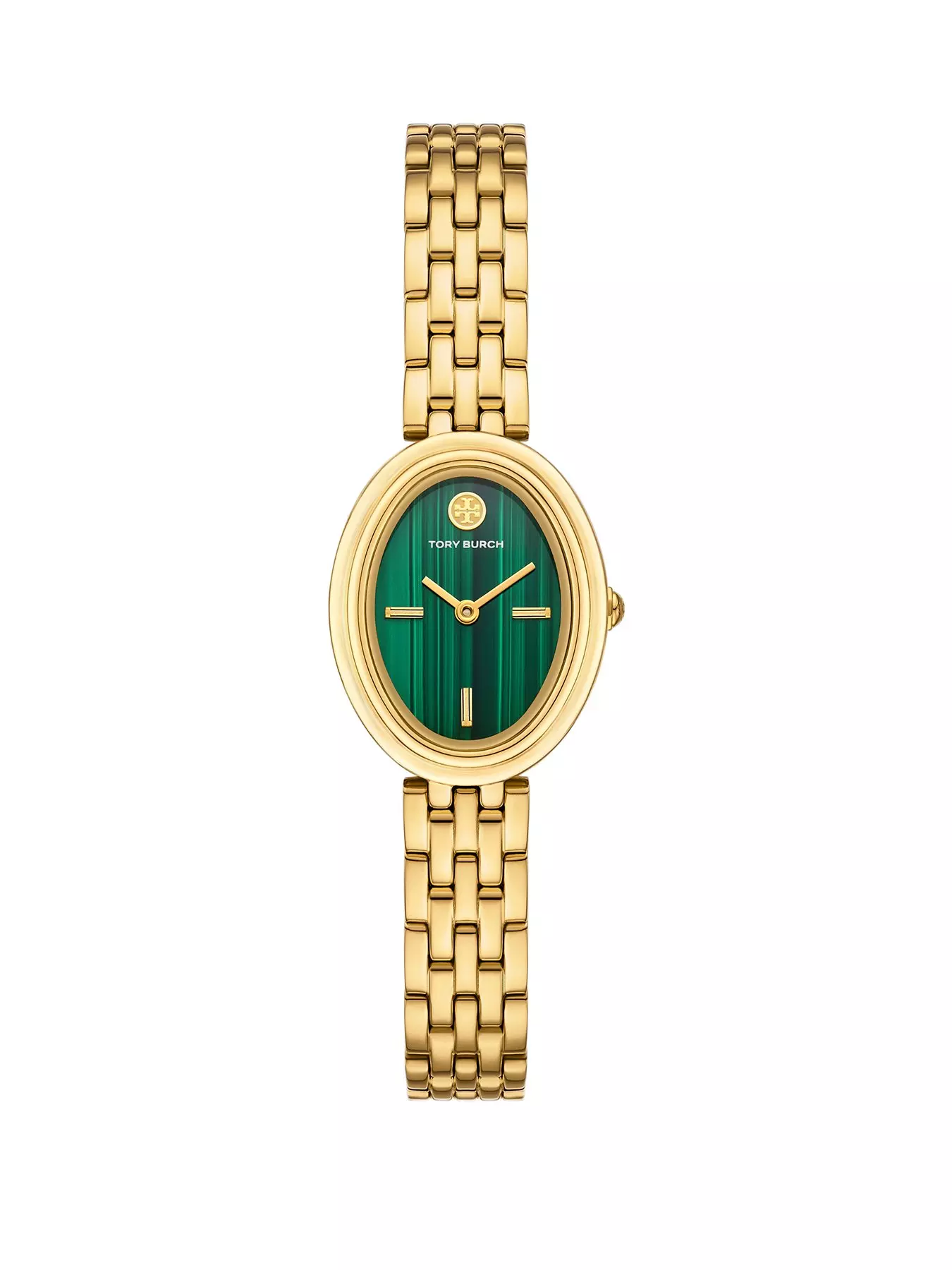 Delicate and striking, an oval-shaped case with a malachite dial is crafted in gold-tone stainless steel. A classic link bracelet completes the elegant watch.- Height: 7 MM