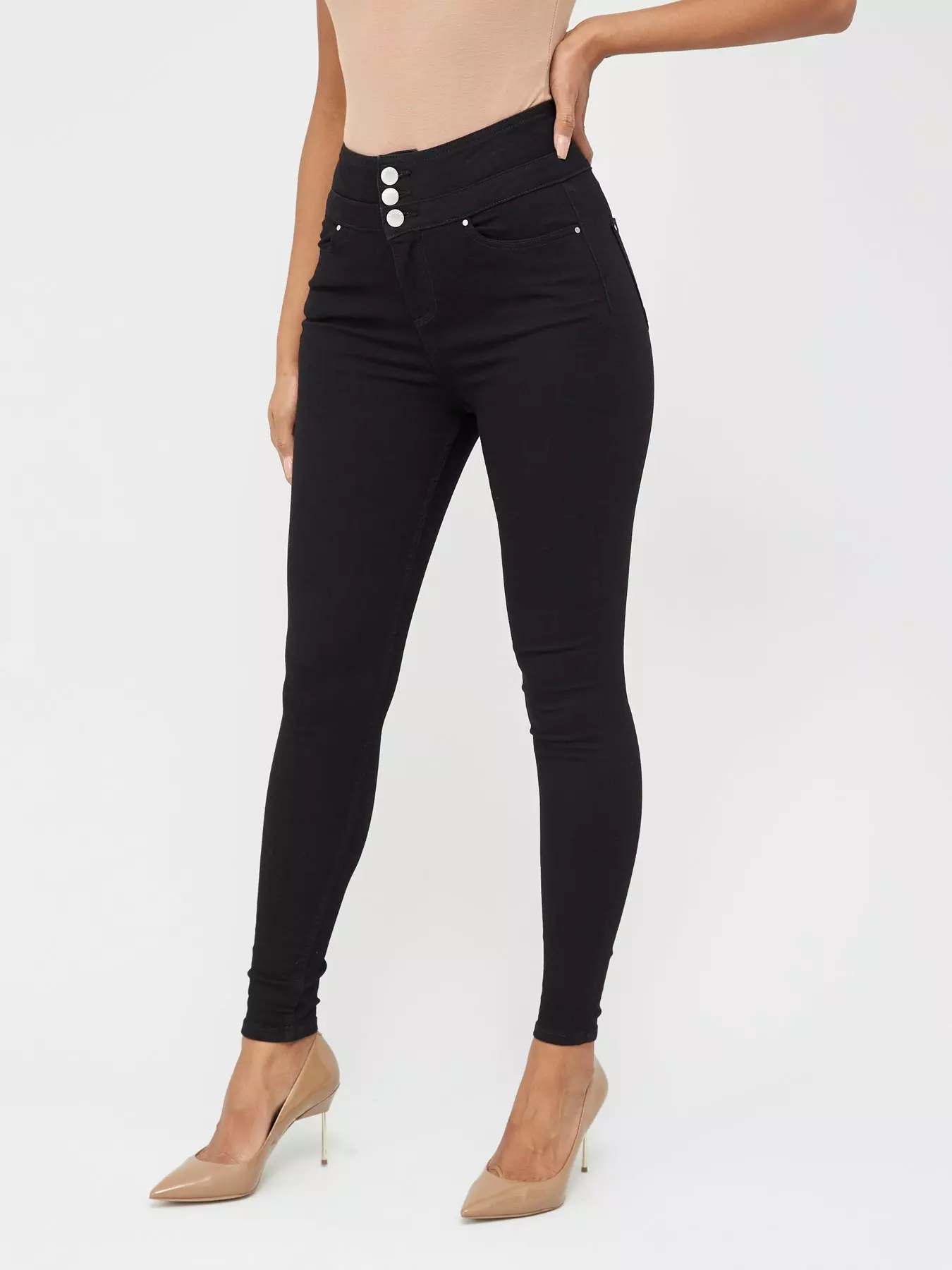 The skinny jean with a sculpting double waistband and three buttons to flatter the waist.