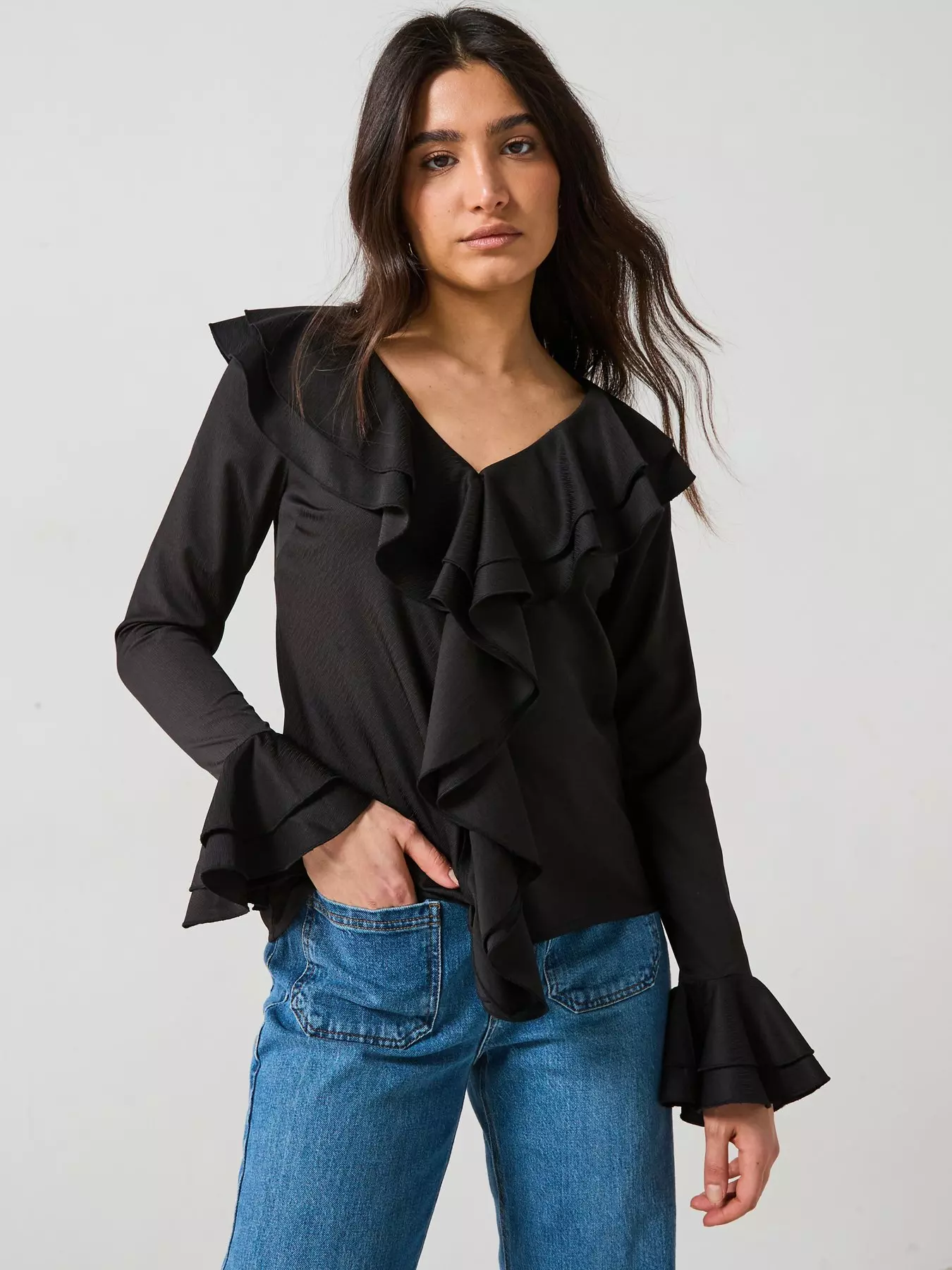 V by VeryV Neck Ruffle Longline Blouse - Black