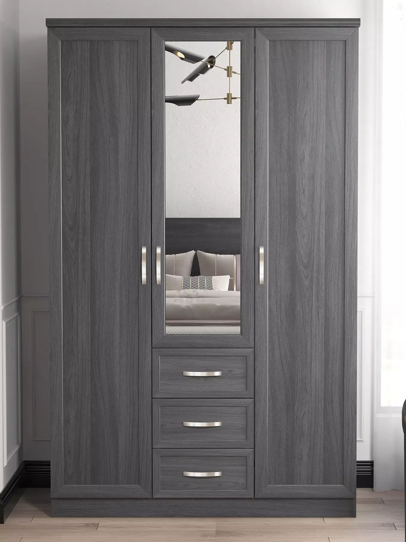 Very Home Camberley 3 Door, 3 Drawer Mirrored Wardrobe in Dark Oak Effect, White or Oak Effect.