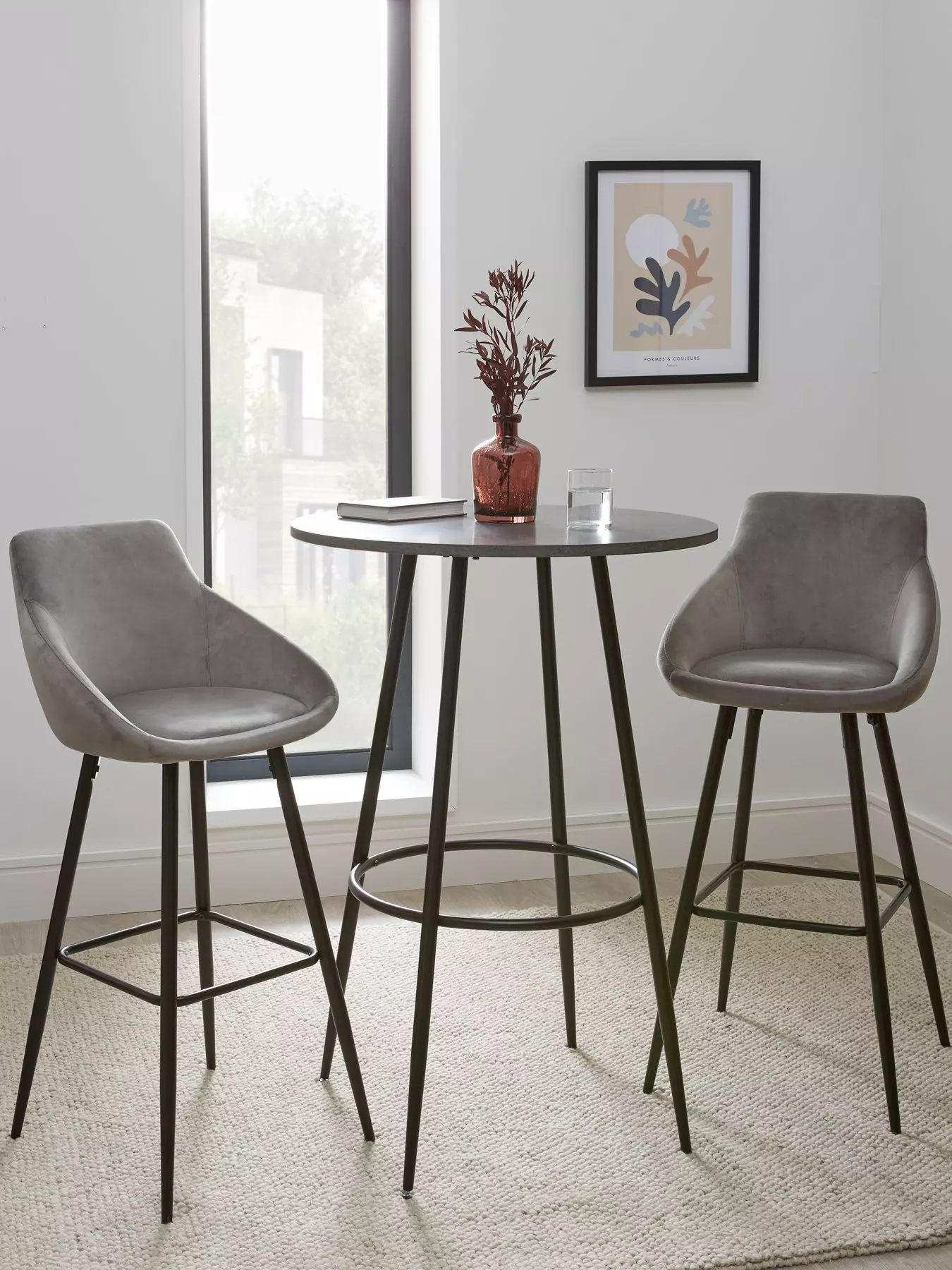 The table comes complete with a pair of high stools that are cushioned for comfort and wrapped in a soft velvety grey fabric. They're finished with supportive metal tube legs to match the table - these also sit at a slanted angle for a touch of Scandi charm.