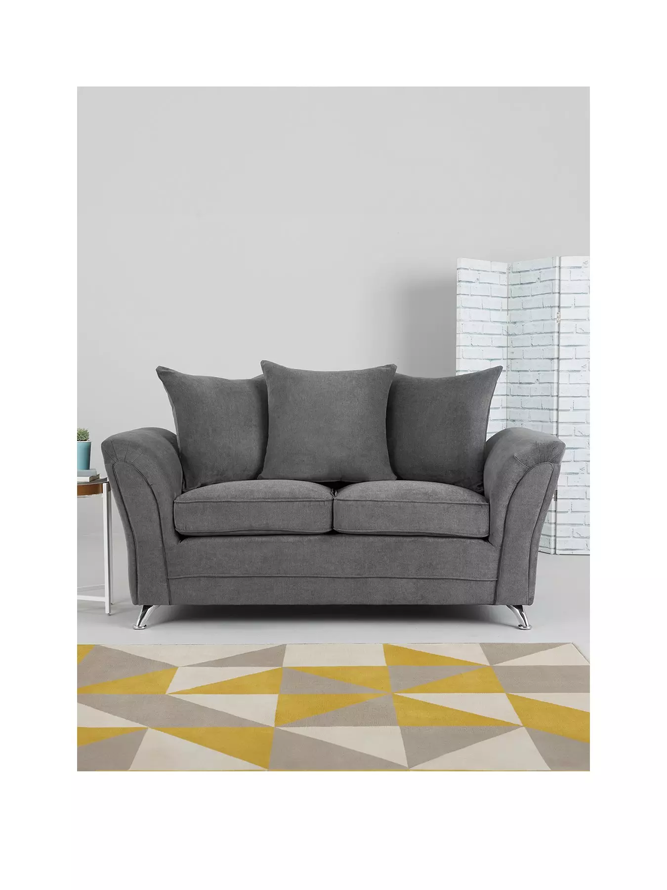 Fashionable flared arms with pinched detail to the front rise up to an eye-catching point, creating a narrow profile that's beautifully offset by the plump fibre-filled scatter cushions. Echoing the angle of the sides are the contemporary chrome feet that add a little shine to the sofa.
