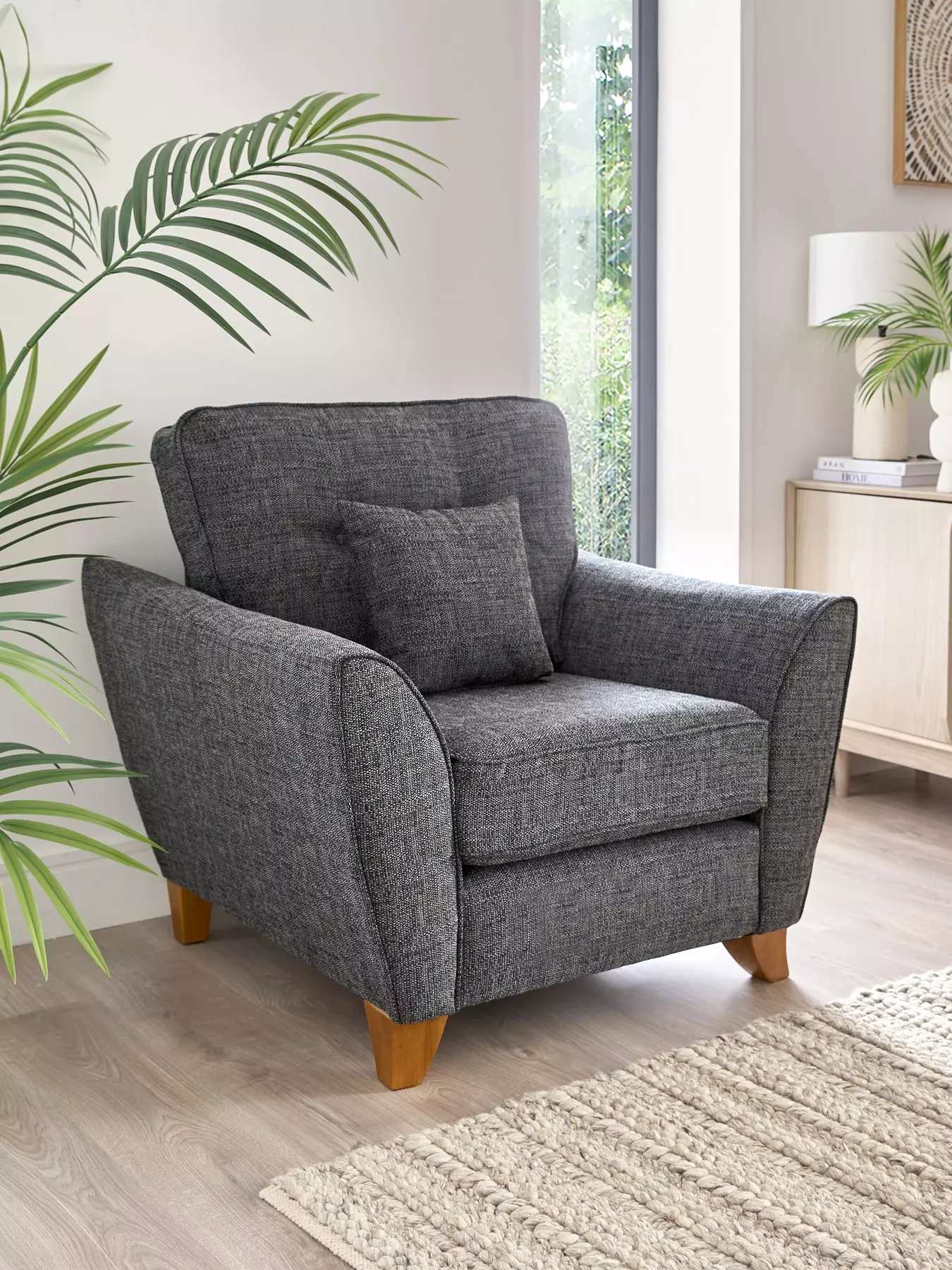 This great value armchair from Very Home's Halstow collection is wrapped in a wonderfully woven fabric that features a charcoal colourway. Styled with button-back cushions, stunning sloped arms and wooden feet that sit at an opposite angle, it comes complete with a single accent cushion.