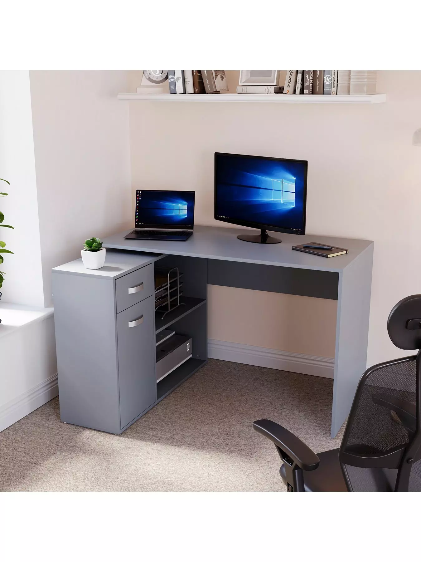 Introducing our innovative Longton Adjustable Computer Desk, designed to provide maximum flexibility and convenience for your workspace. Crafted from high-quality MDF for durability and stability, this desk can be used as a flat wall desk or an L-shaped corner desk, depending on your needs. Featuring a single drawer, two external shelves, and two internal shelves, this desk provides ample storage space for your computer, office supplies, and other essentials. The spacious work surface provides ample space for your computer, paperwork, and other essentials, making it ideal for both work and study.Designed with both style and function in mind, this desk is perfect for use in a variety of settings, from home offices to dorm rooms to professional workplaces. Its innovative adjustable design allows it to adapt to your changing needs, while its sturdy construction ensures reliable and long-lasting use. Crafted with care and attention to detail, this adjustable computer desk is built to last and will provide years of reliable use. Its timeless design and superior quality make it a must-have for anyone who values style, functionality, and durability.