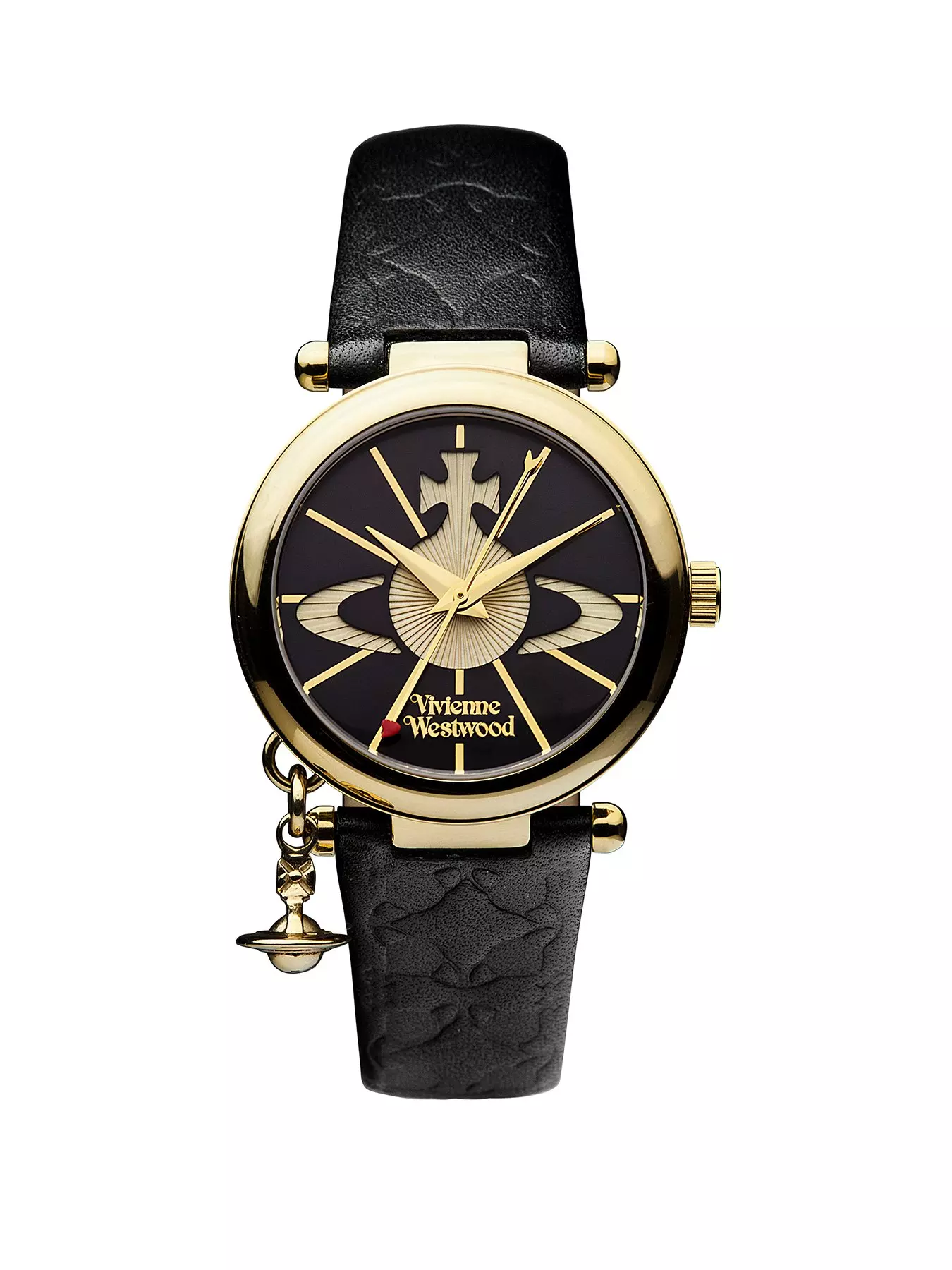 Vivienne WestwoodOrb II Black and Gold Logo Dial Gold Plated Case and Charm Black Leather Strap Ladies Watch