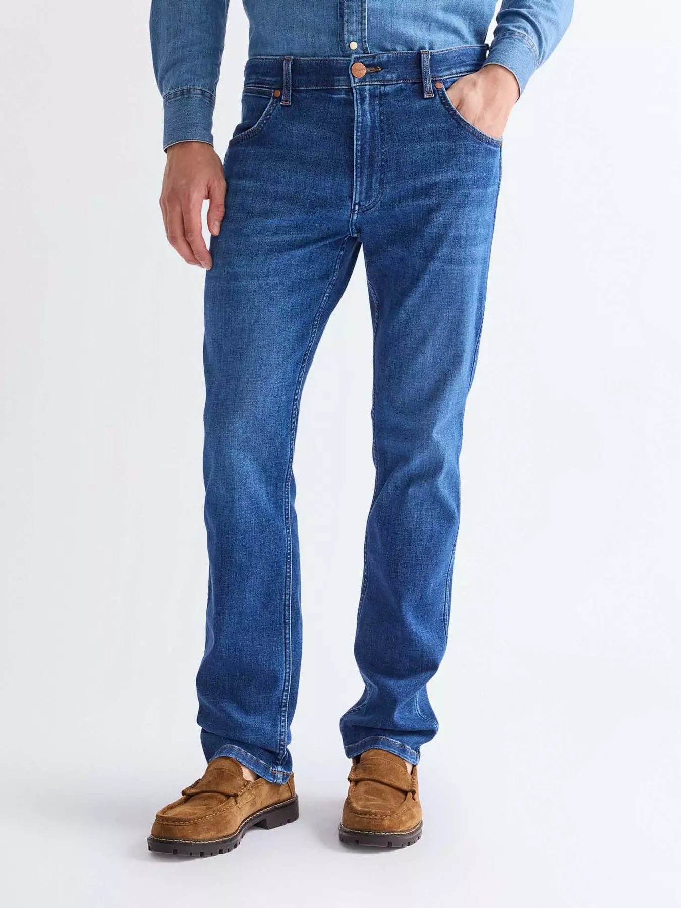 - Features include a zip fly with a button fastening, 7 belt loops, signature 'W' stitching and an updated brown leather patch on the back pocket.