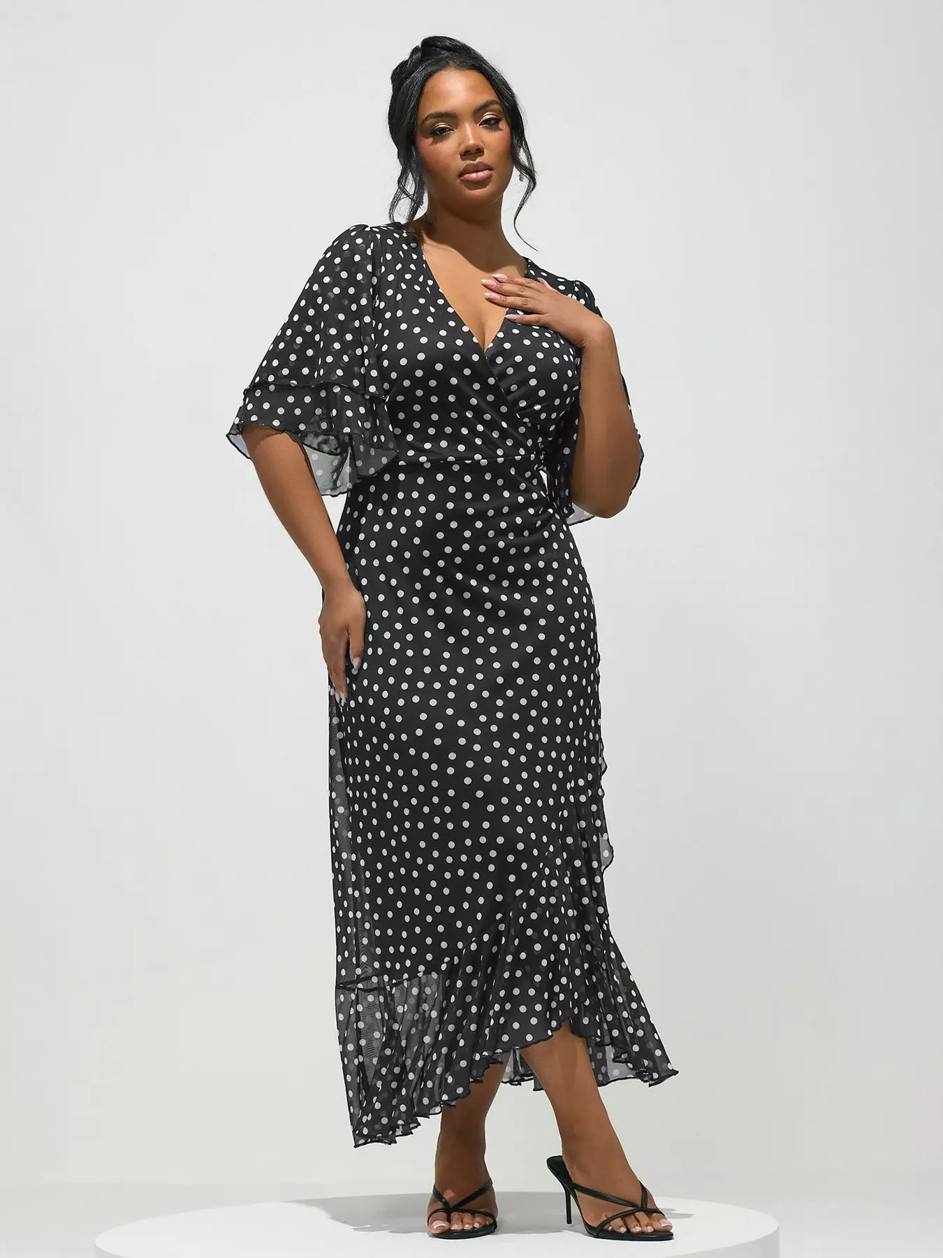 Yours Curve Polka Dot Mesh Ruffle Wrap Dress