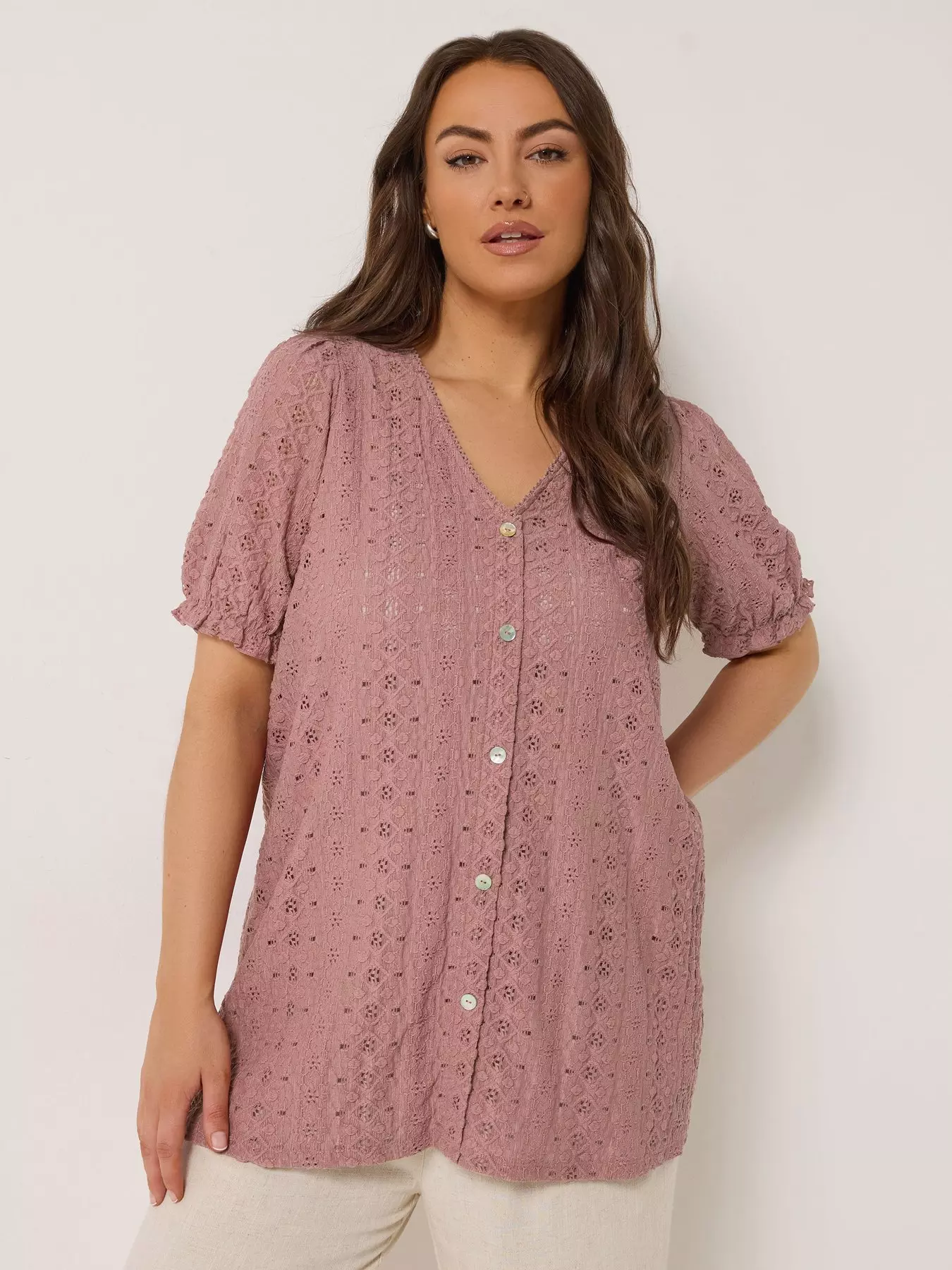YoursCurve Puff Sleeve Anglaise Blouse - Pink